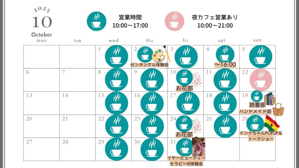 10月カフェ営業カレンダー 2025 10/07 お知らせ カフェ 2025年10月7日 2025年10月7日 お知らせ カフェ カフェ 八王子カフェ 南大沢 南大沢カフェ よかったらシェアしてね! URLをコピーしました! URLをコピーしました! ヨガスケジュール2025年9月 ヨガスケジュール2025年10月 関連記事 ヨガスケジュール2025年10月 2025年10月7日 ヨガスケジュール2025年9月 2025年8月29日 ヨガスケジュール2025年6月 2025年6月1日 ヨガスケジュール2025年5月 2025年5月1日 ヨガスケジュール2025年4月 2025年4月1日 ヨガスケジュール2025年3月 2025年2月28日 ヨガスケジュール2025年2月 2025年2月1日 ヨガスケジュール2025年1月 2024年12月31日